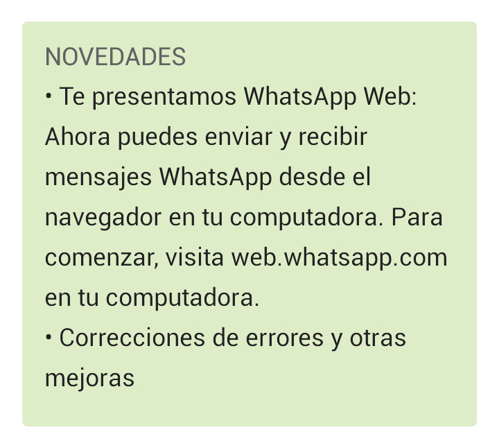 1. Actualiza tu versión de WhatsApp a la 2.11.498. En la tienda de aplicaciones ya te indican que la versión web esta disponible.