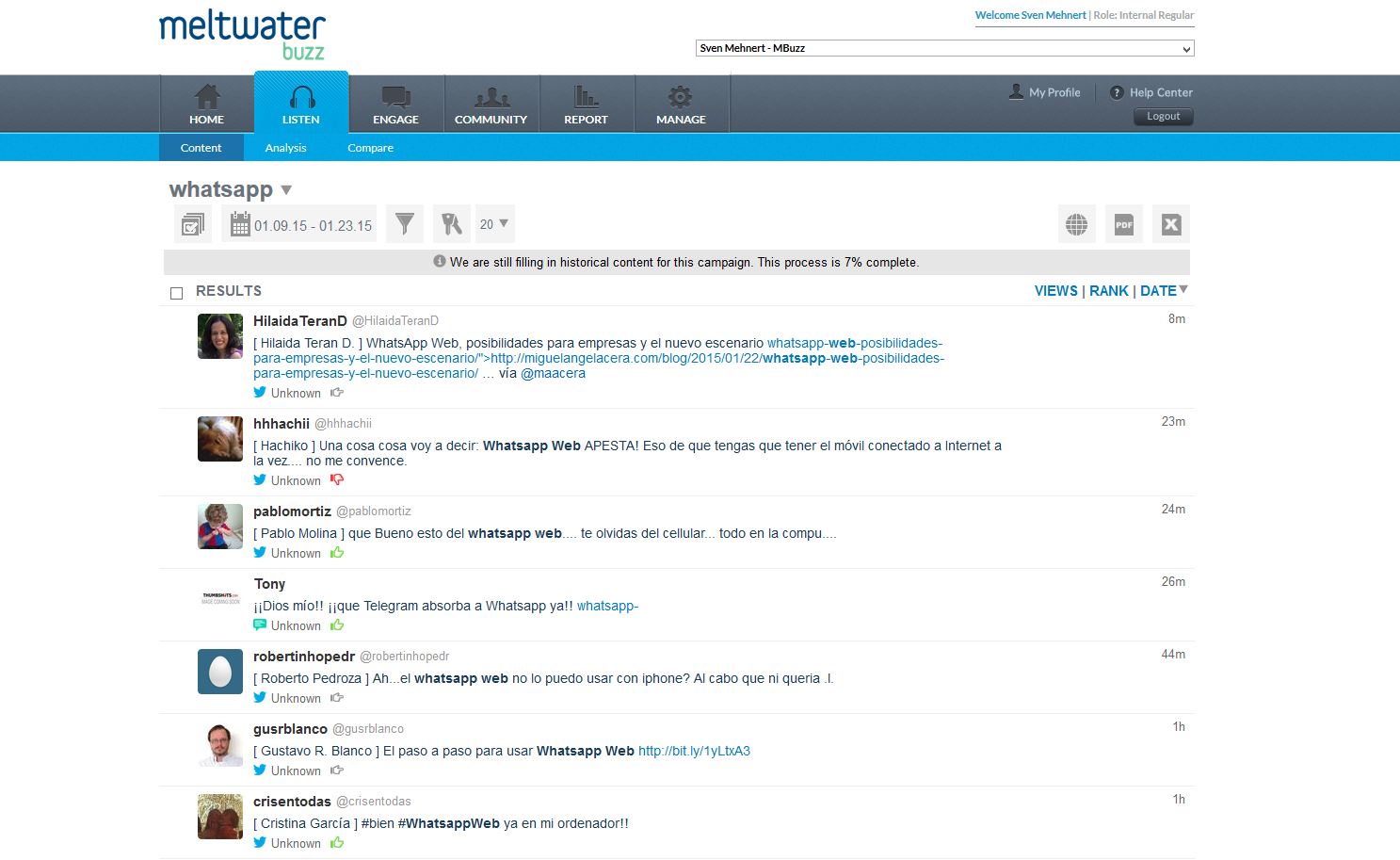 La plataforma de monitorización de Meltwater es muy sencilla e intuitiva, permitiendo monitorizar una palabra o hashtag dejándolo monitorizando por el programa y pudiendo en cualquier momento exportar los datos en csv, pdf, o Excel. Muy útil para organizar luego los datos de una manera personalizada.