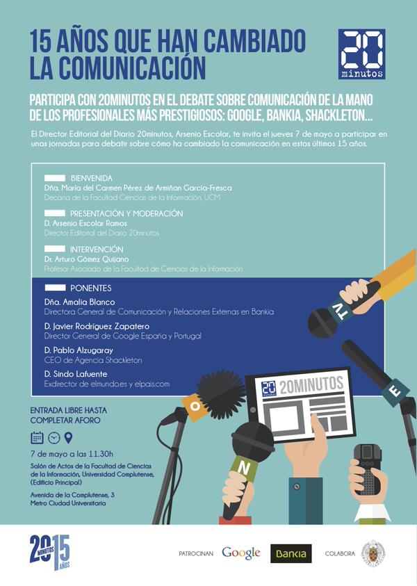 Este jueves 7 de Mayoen la Universidad Complutense de Madrid se celebra el evento 15 años que han cambiado la comunicación. Evento patrocinado por 20 minutos, Google, Bankia y la Universidad Complutense de Madrid.