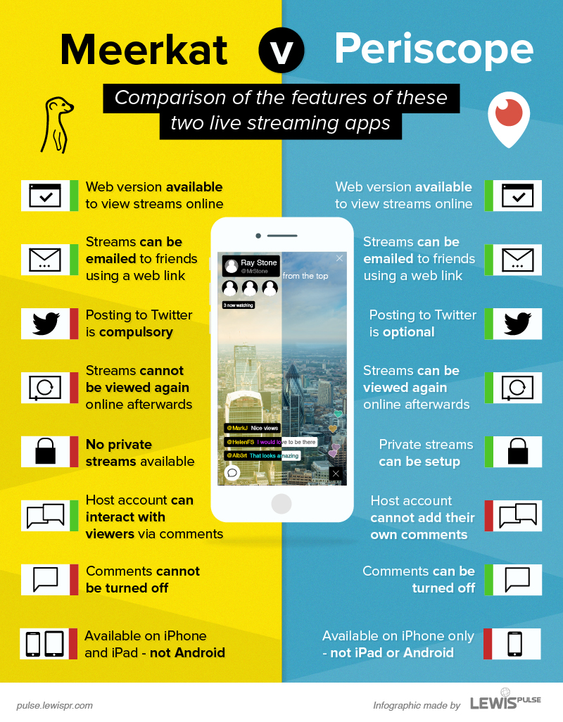 Meerkat y Periscope son aplicaciones con las cuales puede realizar streaming de videos en Twitter y revolucionando así las redes sociales. Meerkat y Periscope nos permiten mostrar cómo es nuestra vida en tiempo real. Satisfaciendo las necesidades desde los más boyeristas, pasando por los más exibicionistas e incluyendo a cualquier figura mediática que quiera mantener un contacto más cercano con su comunidad.